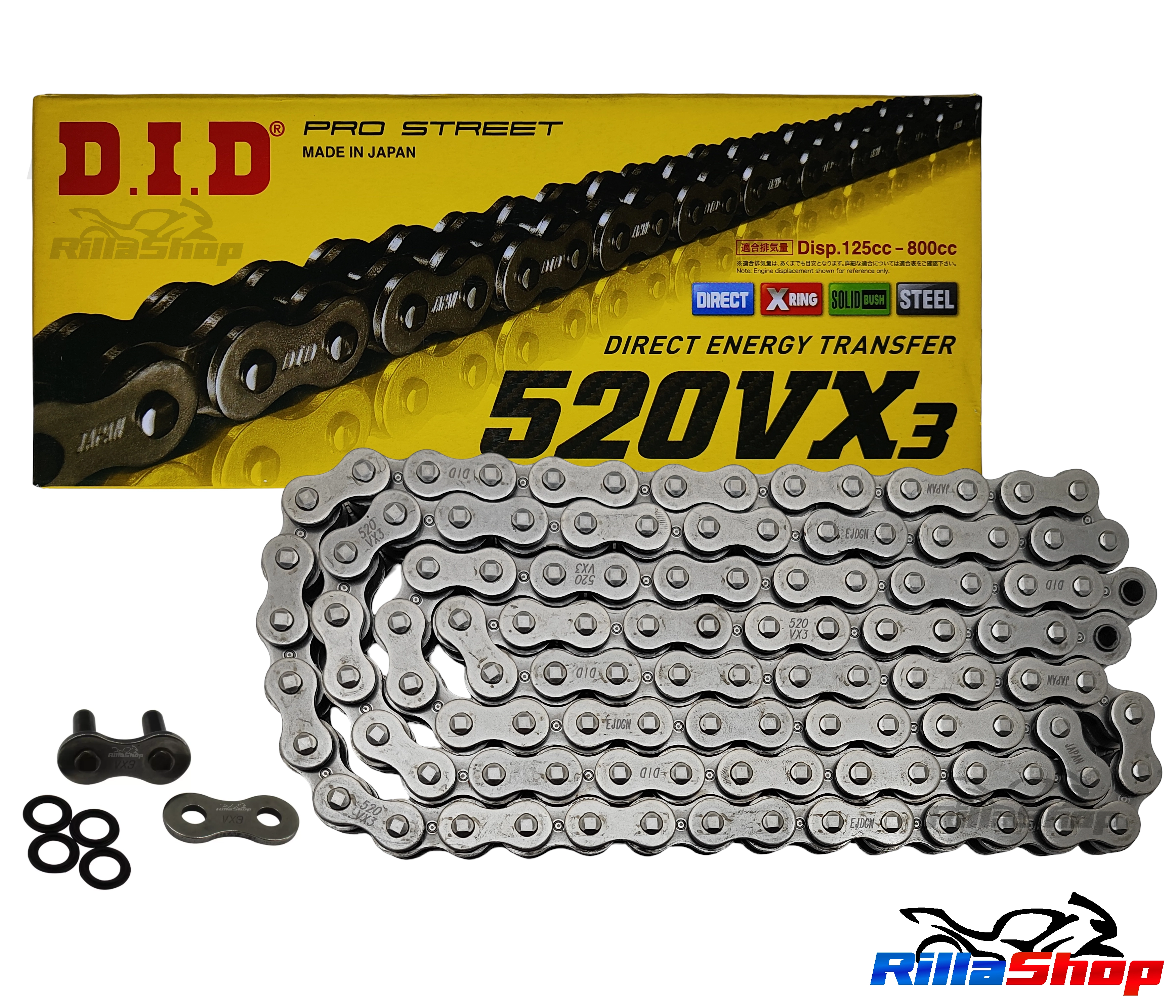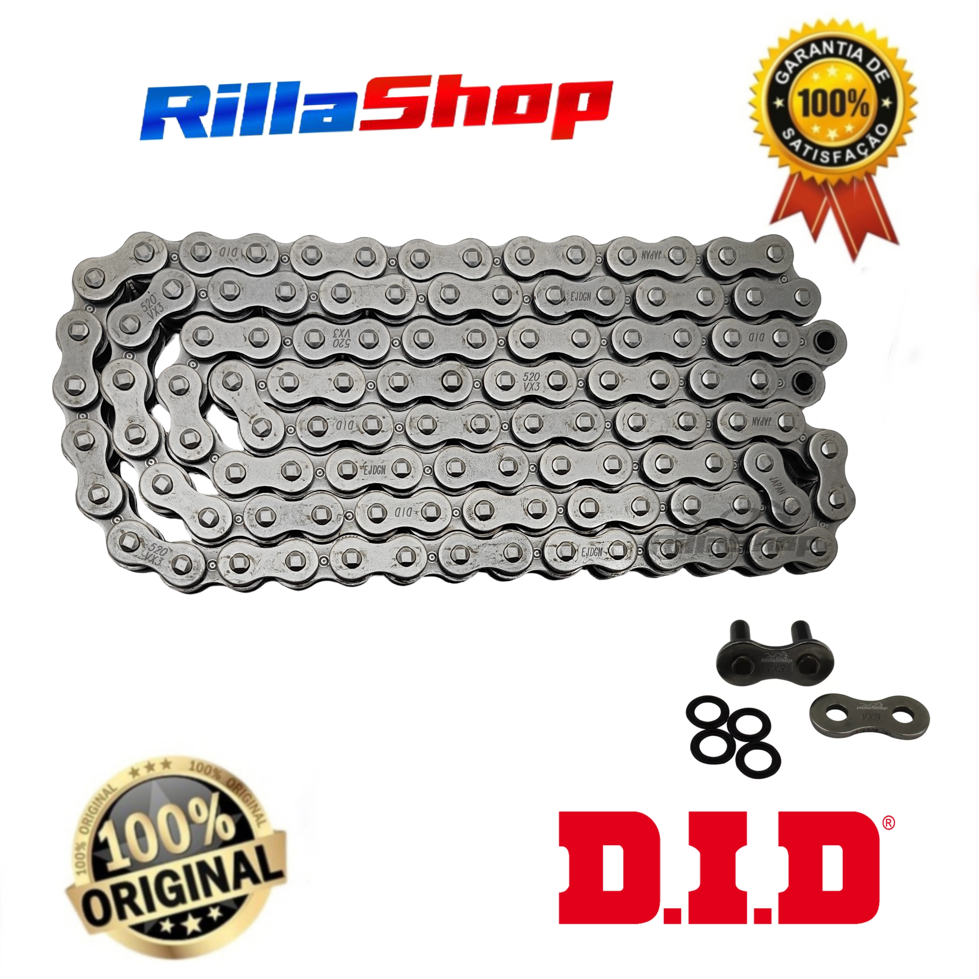 A linha D.I.D 520 VX3 é perfeita para atender as especificações de força e tecnologia, possuindo emenda tipo ZJ: O elo de emenda ZJ segue o mais alto grau de segurança e desempenho. Uma vez instalado, a corrente tem características de fechamento sem emendas, que garante menor nível de ruído, menor alongamento e principalmente maior vida útil. As emendas ZJ possuem placas de fechamento com interferência, ou seja, são montadas com prensagem. Uma vez na posição correta, a placa é travada pela rebitagem da extremidade dos pinos.