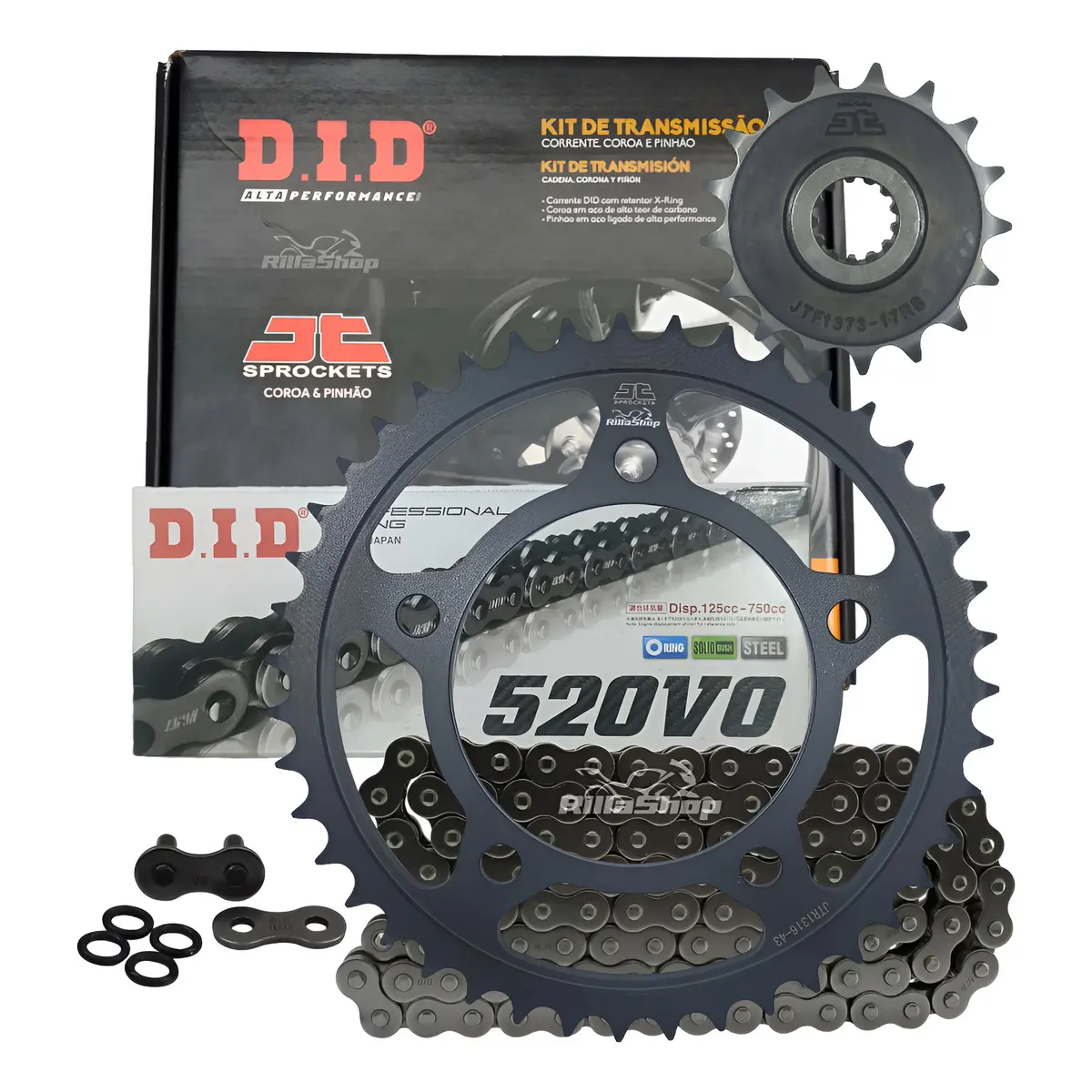 A linha D.I.D 520 V0 é perfeita para atender as especificações de força e tecnologia, possuindo emenda tipo ZJ: O elo de emenda ZJ segue o mais alto grau de segurança e desempenho. Uma vez instalado, a corrente tem características de fechamento sem emendas, que garante menor nível de ruído, menor alongamento e principalmente maior vida útil. As emendas ZJ possuem placas de fechamento com interferência, ou seja, são montadas com prensagem. Uma vez na posição correta, a placa é travada pela rebitagem da extremidade dos pinos.