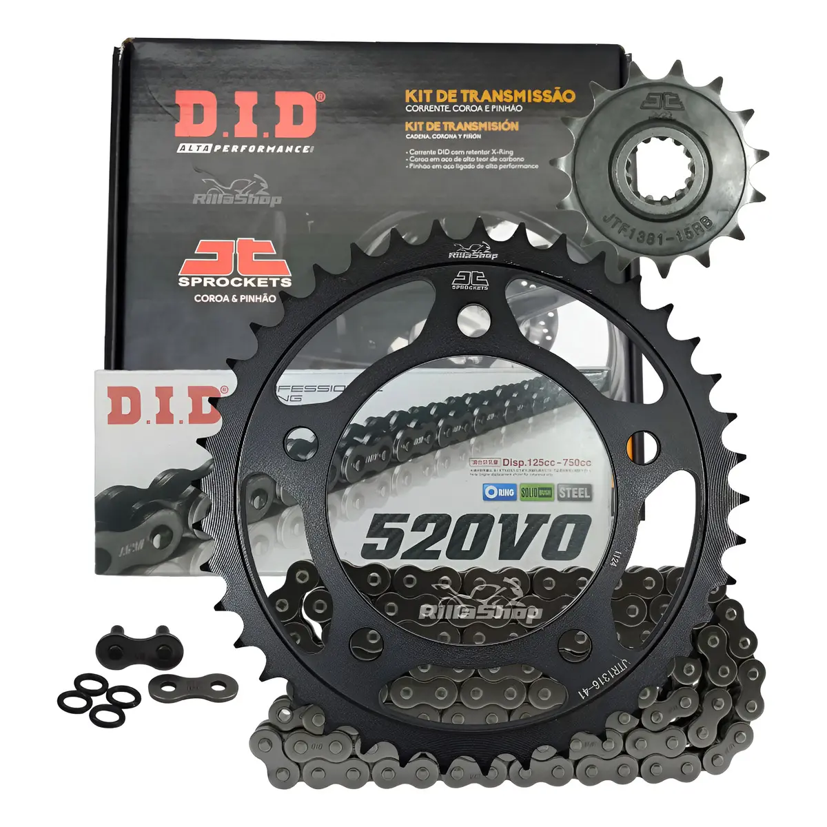 A linha D.I.D 520 V0 é perfeita para atender as especificações de força e tecnologia, possuindo emenda tipo ZJ: O elo de emenda ZJ segue o mais alto grau de segurança e desempenho. Uma vez instalado, a corrente tem características de fechamento sem emendas, que garante menor nível de ruído, menor alongamento e principalmente maior vida útil. As emendas ZJ possuem placas de fechamento com interferência, ou seja, são montadas com prensagem. Uma vez na posição correta, a placa é travada pela rebitagem da extremidade dos pinos.
