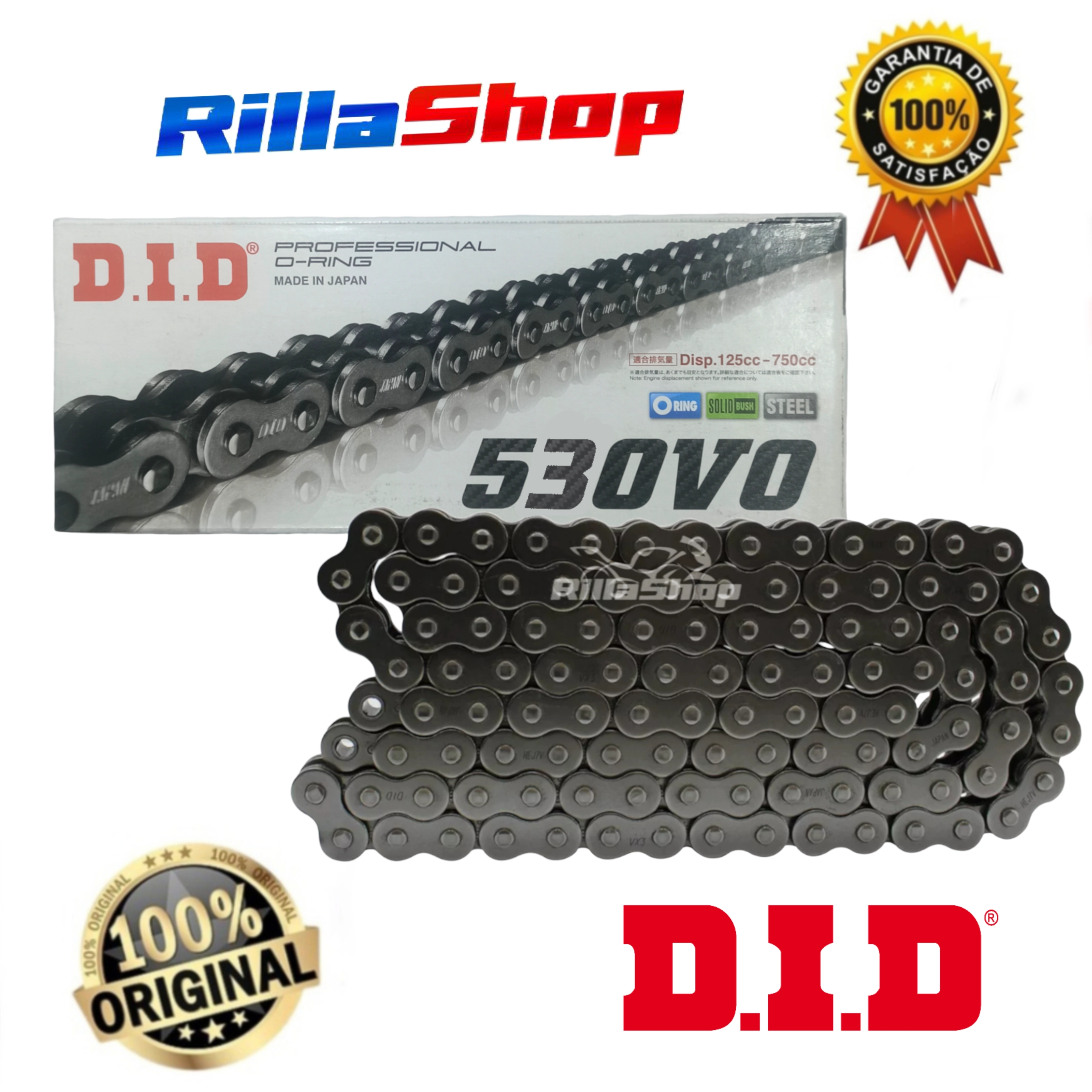 A linha D.I.D 530 V0 é perfeita para atender as especificações de força e tecnologia, possuindo emenda tipo ZJ: O elo de emenda ZJ segue o mais alto grau de segurança e desempenho. Uma vez instalado, a corrente tem características de fechamento sem emendas, que garante menor nível de ruído, menor alongamento e principalmente maior vida útil. As emendas ZJ possuem placas de fechamento com interferência, ou seja, são montadas com prensagem. Uma vez na posição correta, a placa é travada pela rebitagem da extremidade dos pinos.