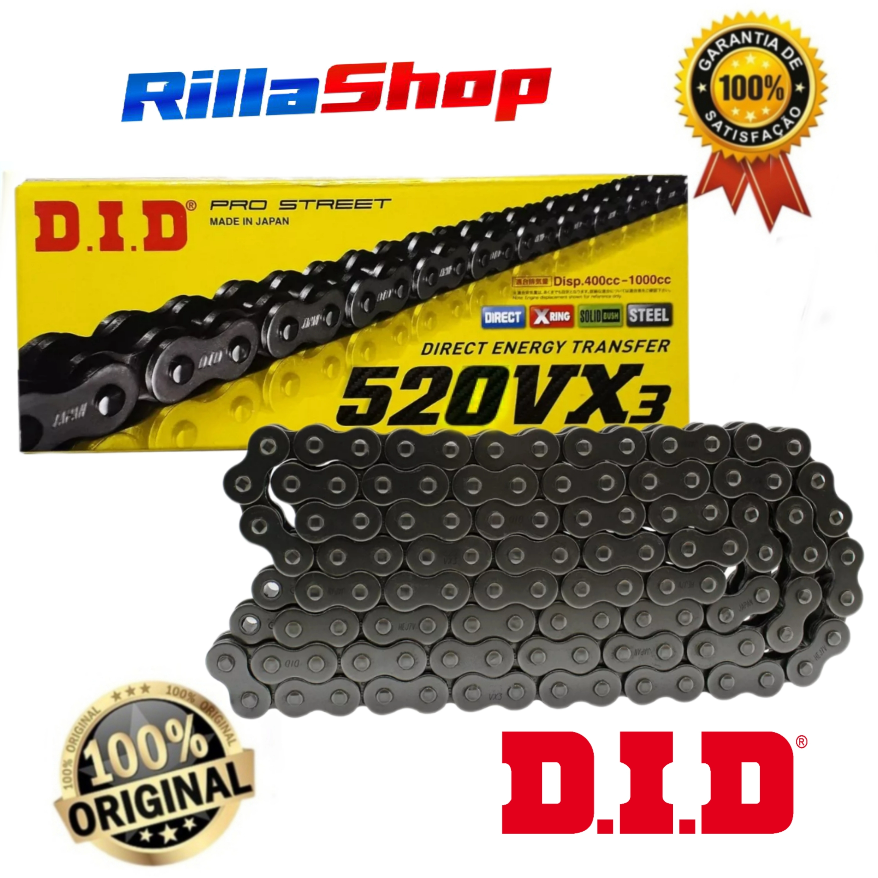 A linha D.I.D 520 VX3 é perfeita para atender as especificações de força e tecnologia, possuindo emenda tipo ZJ: O elo de emenda ZJ segue o mais alto grau de segurança e desempenho. Uma vez instalado, a corrente tem características de fechamento sem emendas, que garante menor nível de ruído, menor alongamento e principalmente maior vida útil. As emendas ZJ possuem placas de fechamento com interferência, ou seja, são montadas com prensagem. Uma vez na posição correta, a placa é travada pela rebitagem da extremidade dos pinos.