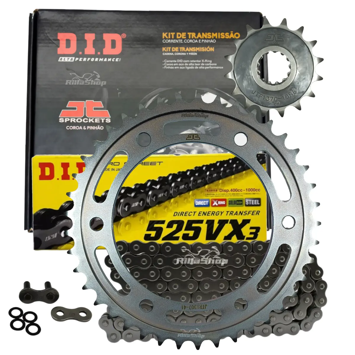 A linha D.I.D 525 VX3 é perfeita para atender as especificações de força e tecnologia, possuindo emenda tipo ZJ: O elo de emenda ZJ segue o mais alto grau de segurança e desempenho. Uma vez instalado, a corrente tem características de fechamento sem emendas, que garante menor nível de ruído, menor alongamento e principalmente maior vida útil. As emendas ZJ possuem placas de fechamento com interferência, ou seja, são montadas com prensagem. Uma vez na posição correta, a placa é travada pela rebitagem da extremidade dos pinos.
