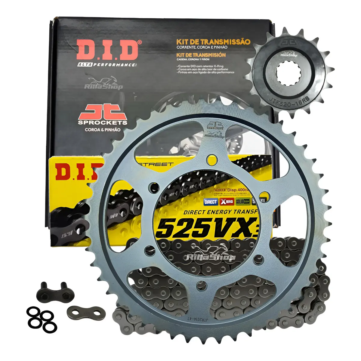 A linha D.I.D 525 VX3 é perfeita para atender as especificações de força e tecnologia, possuindo emenda tipo ZJ: O elo de emenda ZJ segue o mais alto grau de segurança e desempenho. Uma vez instalado, a corrente tem características de fechamento sem emendas, que garante menor nível de ruído, menor alongamento e principalmente maior vida útil. As emendas ZJ possuem placas de fechamento com interferência, ou seja, são montadas com prensagem. Uma vez na posição correta, a placa é travada pela rebitagem da extremidade dos pinos.